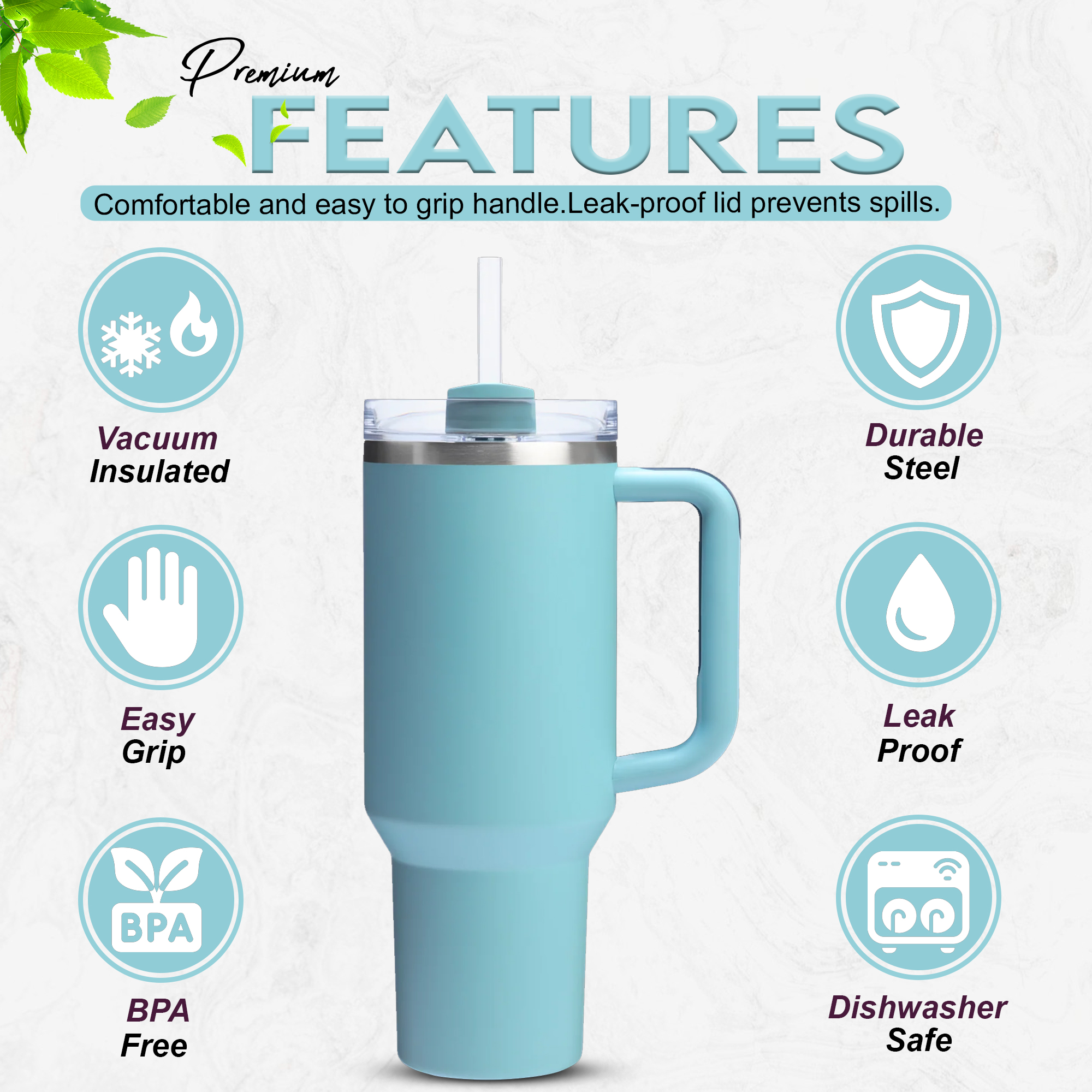 The ergonomic handle provides a comfortable grip, while the leakproof clear lid and reusable straw make sipping on the go easy. Its slim base fits most UK car cup holders, making it the perfect everyday companion for travel, gym, office, or outdoor adventures.